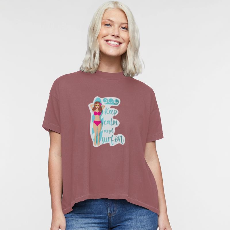 Keep calm and surf on pink bikini girl on waves
